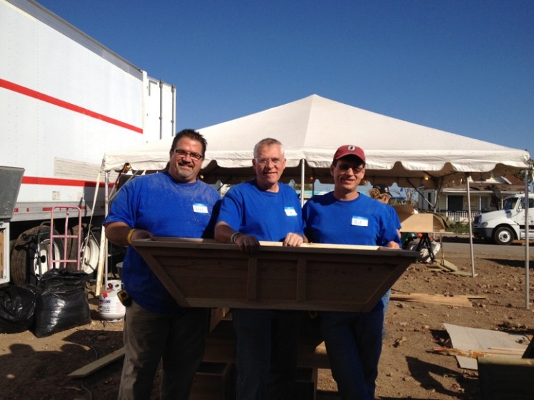 We began assembly on the altar, and it went fairly well. In order to keep it very level and straight I decided to use the back of the nearby semi trailer. This worked out great! However, I mistakenly placed one shelf in the wrong position, and we have to figure out how to fix it. Big oops on my part…
