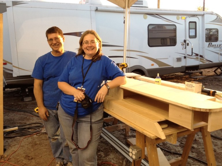 Chris and I helped work on the altar and then got assigned to a new project. Gina’s dad Loren also joined us, and we went to house #4 to check measurements. The new project is a set of faux steps for a girls room, and it is an amazing design! I can’t wait to see it finished, and I will share pics as it comes together.