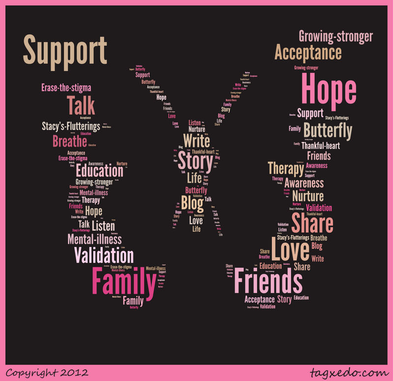 Since Stacy’s Flutterings blog exists in large part to help erase the stigma of mental illness I was thrilled to learn about the blog party. However, and interestingly enough, as I type the words that you are reading I find myself wondering where to begin as I share our story. Do I start with where we are at today or do I go back to the beginning? I think I will start by telling you a little about my beautiful loved one. I have a daughter who is 22 years old. She has bipolar disorder. When her illness unfolded during her high school years I found that I wasn’t equipped to deal with it, especially the subsequent suicide attempts. I attribute that in large part to the fact that mental illness is not talked about. I grew up with the notion that mental illness was something to be afraid of. On the contrary, it is nothing to be afraid or ashamed of. In fact, mental illness is just that. It is an illness just like any other illness, and there are treatments available to help individuals find and maintain mental wellness and stability. The National Alliance on Mental Illness (NAMI) has a wealth of information available on their website regarding treatment and support. They also have detailed information about a multitude of mental illnesses. If you haven’t done so I encourage you to check them out!