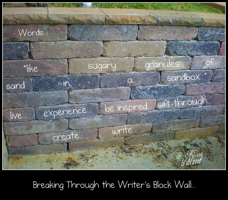 At this very moment as I type the following words…I notice something…the words are flowing…my fingers are once again moving effortlessly as thoughts begin to flood my mind. The writer’s block wall has begun to crumble…Kim’s idea to “just write” worked!