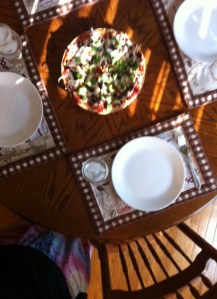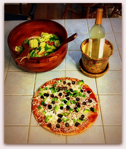 In an effort to find a healthier balance and create a more relaxing family environment I told the kids recently that they would each be making dinner at least once during the week if they came over. I did this because that way we all share in the responsibility rather than it falling on Bill or I, especially since the kids are grown now. So that is what Kim did last Thursday night. It was probably one of the best dinners I have ever had. We didn’t have Paul or Katlin with us so it wasn’t quite complete, but it was wonderfully different. Kim created two vegetarian pizzas with whole wheat crusts complete with a salad. The food was healthy, fresh, colorful and delicious. Needless to say she did a fantastic job! I shared with her how much it meant to me to see her doing the cooking this time. She smiled and agreed. There was something very special about Kim making dinner. Maybe it was because this was a first or maybe it was because we are so blessed that she is still with us. Maybe it was because it was meant to be noticed. When it was time for dinner she called Bill to come join us. As he walked around the corner he looked pleasantly surprised. A big smile crossed his face. So all three of us sat eating, smiling, talking and enjoying one another…..together.