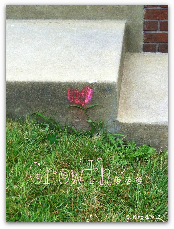 Someone drew a heart on our front step. It remains a mystery to Bill and I as to who drew it. I was going to take a picture of it, but the thought eventually escaped me. Interestingly enough when Katlin stopped by the house a few days ago she asked Bill and I, “Have you seen the heart outside?” We both nodded and said, “Yes.” Bill explained to her that we didn’t know where it came from though. Katlin laughed and said, “Well, it’s a flower now!” Bill and I both looked at Katlin with puzzled looks crossing our faces. She said, “I took a picture of it!” Of course I had to see the picture! I have included it here for you to see as well. It is pretty cool! The blades of grass caught up with the heart, and at first glance it looks like a flower! I love how Katlin noticed the new sidewalk art that mysteriously appeared! And I love that she took a picture of it! Thank you sweetie for sharing and bringing a much needed to smile to our faces. I love you!